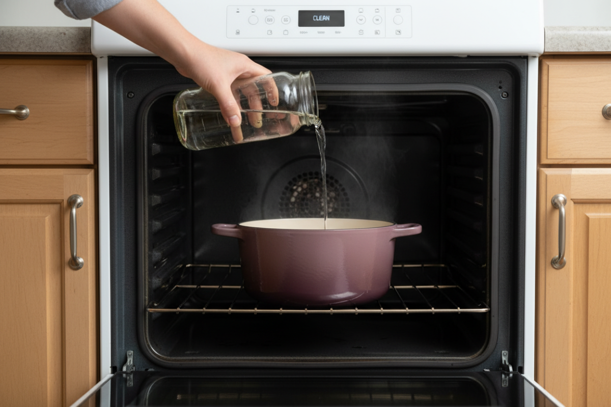 A: Don’t mix methods that the oven manual warns against. Use the steam/vinegar method as described for conventional cleaning; for self-clean cycles, follow manufacturer guidance.