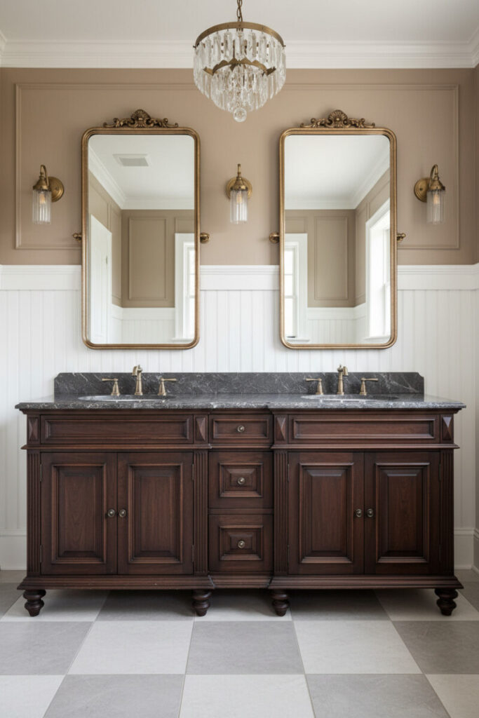 Antique brass brings instant warmth and heirloom polish. It’s a natural fit when your palette leans cream, taupe, or marble gray. For a timeless look, choose scrolled or scalloped frames in an aged finish rather than high-shine styles, and pair them with warm metallics on faucets and hardware. Layer light with fabric-shade sconces for flattering diffusion, and keep the countertop clutter-free so the patina stays the star. Antique brass also pairs beautifully with checkerboard stone floors and beadboard or paneled walls, reinforcing that classic, collected mood many homeowners want from double vanity mirrors.