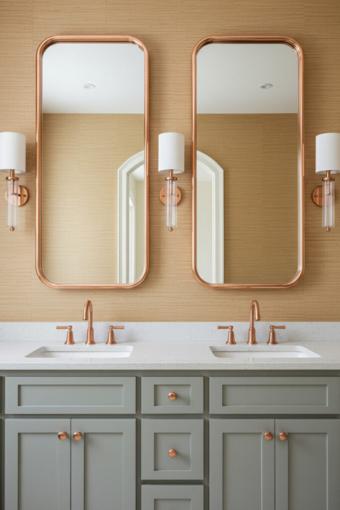 If you crave warmth but want something fresher than brass, consider polished copper. It gleams against sage cabinetry and cool-gray quartz, and it loves ribbed-glass sconces with white shades. In cooler climates or north-facing rooms, copper visually “heats” the palette—a trick designers use in editorial projects and a smart inclusion in your shortlist of Double Bathroom Vanity Mirror Ideas. Bridge faucets in matching copper unify the scene.