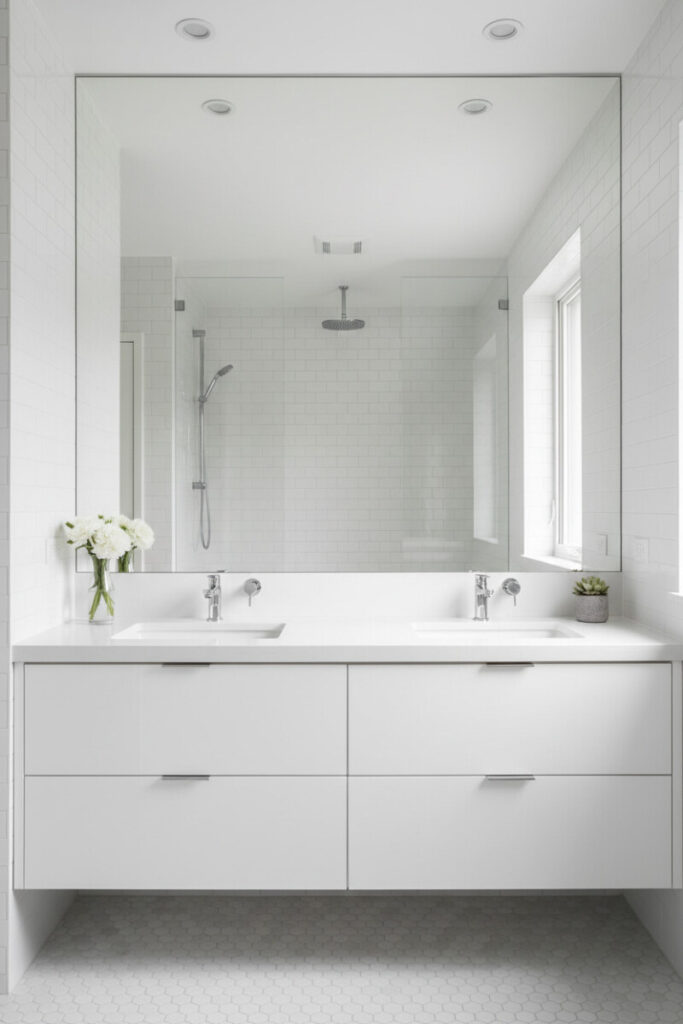 Nothing enlarges a bathroom like a wall of uninterrupted mirror. For a minimal, hotel-luxe vibe, run frameless panels to the ceiling and float the vanity below. You’ll reflect showers, windows, and trim—visually doubling square footage. A key detail: specify polished edges and ensure outlets and sconces are thoughtfully placed. Frameless layouts remain a high-impact entry in bathroom mirror ideas for small baths and powder rooms, but they’re equally transformative over double vanities.