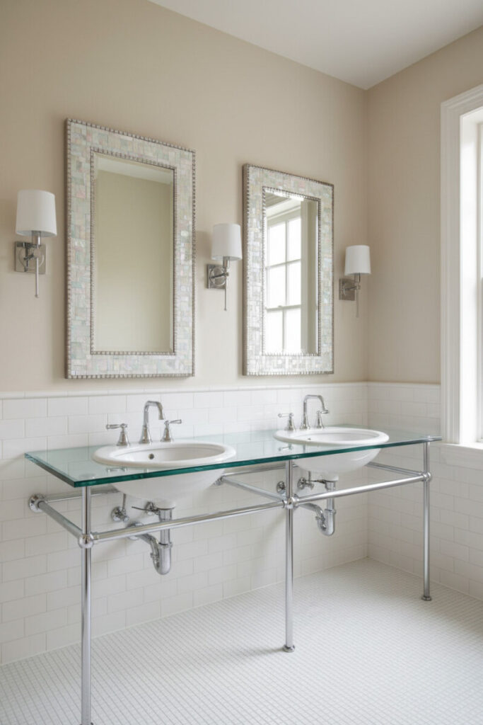Segmented chrome or mirrored mosaics flash like jewelry whenever natural light hits. Use them to add movement to neutral schemes with glass-lid bottles, white subway tile, and a glass console counter. For renters or refreshers, mosaic frames are an easy win among bathroom mirror ideas because they deliver glamour without reno work. Keep accessories chrome and glass for cohesion.