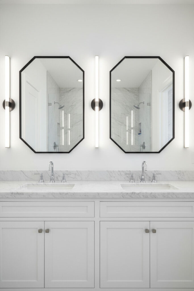 Geometric but classic, octagons inject structure without harshness. Thin black frames and high-key lighting create a crisp, editorial look over shaker cabinetry and Calacatta marble. This is a secret weapon in Double Bathroom Vanity Mirror Ideas for people who want “interesting” without loud. Because the shape is assertive, keep sconces simple (vertical LED bars are perfect) and center the mirrors precisely over each basin.