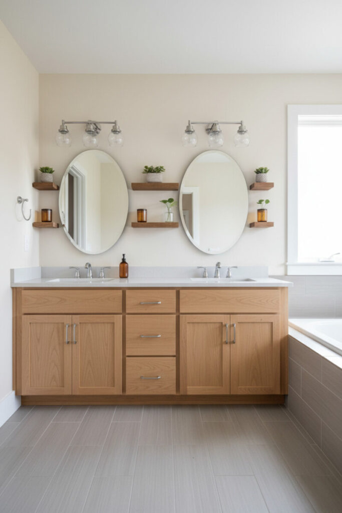 Ovals are universally flattering—on faces and rooms. Chrome-framed ovals over maple cabinetry hit that sweet spot between traditional and modern. Consider floating shelves between mirrors for greenery and essentials; just keep them shallow to avoid bumping lines of sight. Ovals rank high in the best mirrors for double vanity because they separate sinks elegantly in long vanities and work with almost any faucet style.