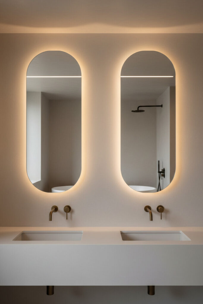 Rounded-rectangle mirrors with soft edges feel contemporary and calm. Add a warm LED halo at 3000K behind each mirror for a glow that frames the face and acts as night lighting. Pair with plaster walls and gooseneck brass faucets for an understated boutique-hotel mood. Designers keep this category in the top tier of bathroom mirror ideas because it blends ergonomics with elegance.