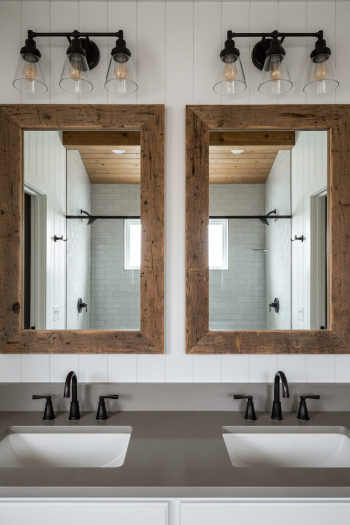 Distressed, reclaimed wood frames over white shiplap are peak cozy farmhouse. Edison-bar sconces add tungsten warmth that enhances the grain. To modernize, use a matte solid-surface top and streamlined bronze faucets. In the world of Double Bathroom Vanity Mirror Ideas, barnwood is proof that texture can carry a design even with a restrained color palette.