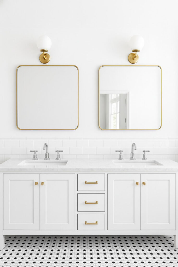 Black frames deliver sharp definition against marble or pale plaster. They’re indispensable when you want graphic clarity without ornate detail. Space your mirrors with vertical light bars between and on the sides to keep illumination even; matte black faucets echo the frames and complete a tight monochrome story. It works across modern, transitional, and even Japandi spaces.