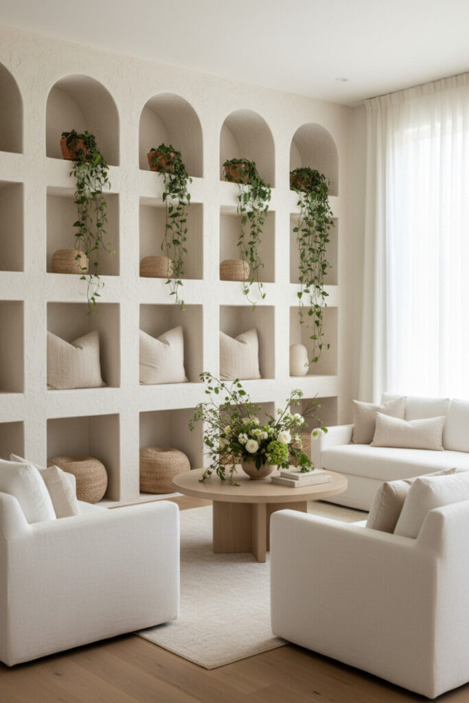 Arched niches carved into creamy plaster turn storage into sculpture. Fill upper alcoves with trailing greenery and lower alcoves with pillows and woven poufs for tactile depth. Pair with relaxed white slipcovered seating and a circular pedestal table in light oak to keep the mood serene. The result is an airy composition that celebrates stucco texture, linen wrinkles, and natural light—perfect for cozy afternoons. If you’re gathering Farmhouse Living Room Ideas for a high-key, minimalist look, this layout nails the brief with its gentle curves and organic materials.