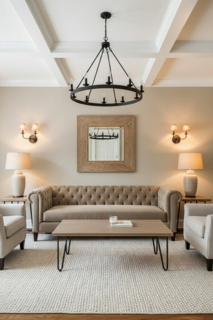 Layered lighting—ring chandelier, sconces, and sculptural lamps—bathes a biscuit-beige Chesterfield and neutral armchairs in warm glow. A mirror bounces illumination back into the room, and a woven rug tempers the formal lines. If your goal is cozy farmhouse living room with neutral palette, this scheme delivers comfort and polish.