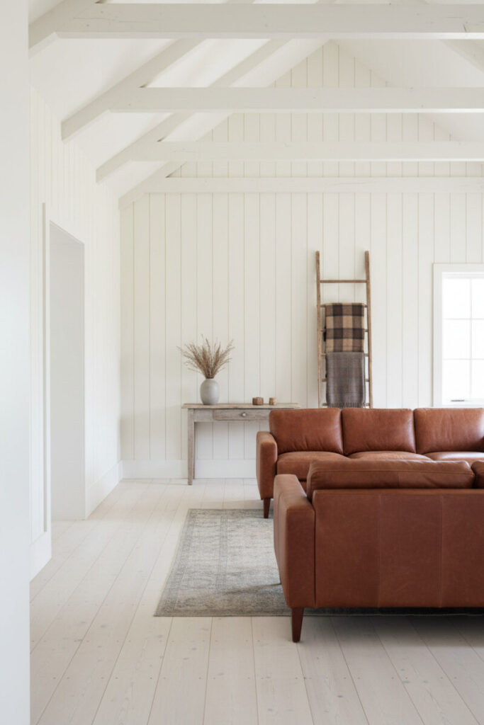 White shiplap, vaulted ceilings, and bleached floors set a bright tone; a cognac leather sofa and chairs provide a sleek counterpoint. A distressed ladder with plaid throws and a slim console add subtle character. This uncluttered approach is tailor-made for modern farmhouse living room purists.