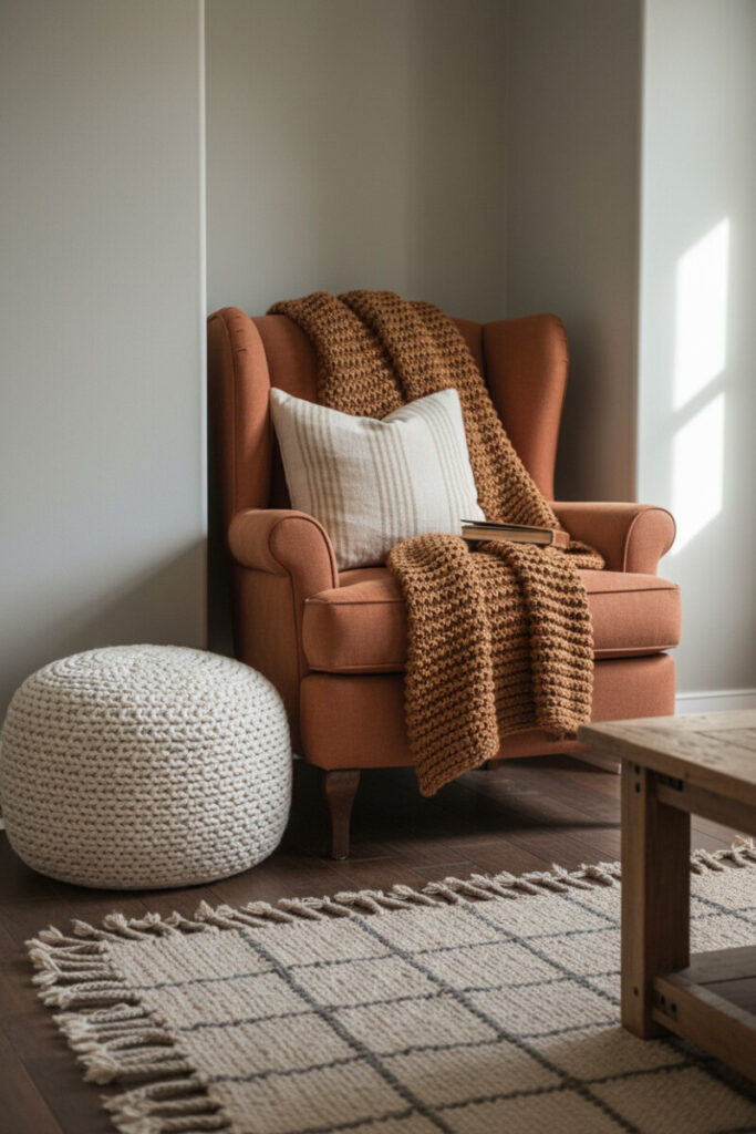 A cinnamon-toned wingback tucked into a taupe niche proves that a reading corner can be a star. Add a chunky knit throw, a cream pillow, and a crocheted pouf for tactile richness. With soft side lighting, every texture reads beautifully—one of those small-but-mighty Farmhouse Living Room Ideas that elevates daily rituals.