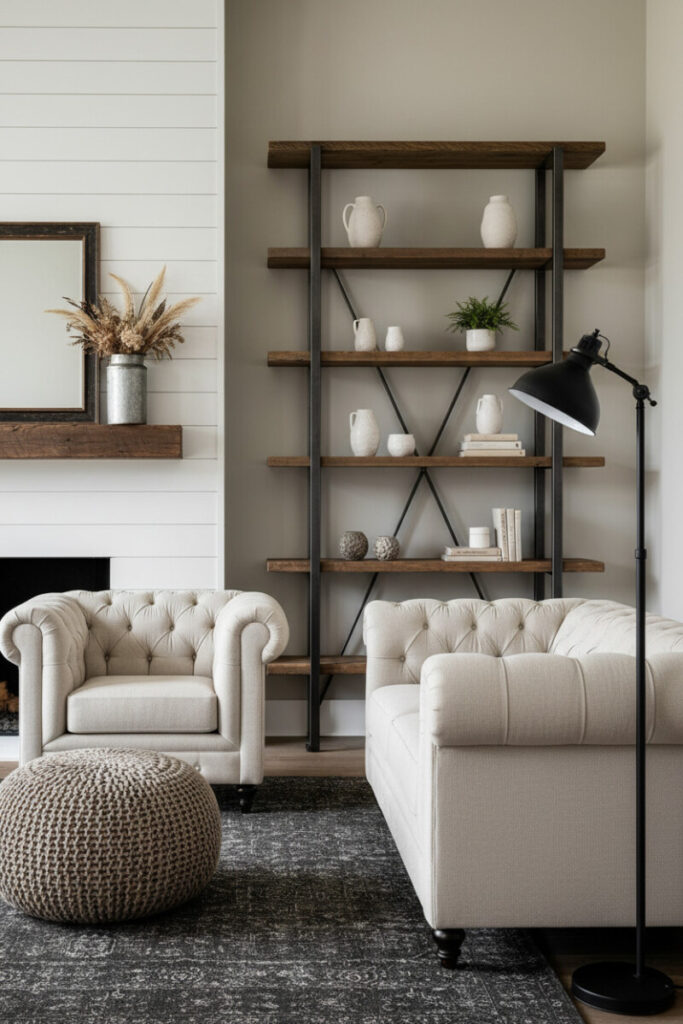 A cream tufted sofa contrasts with charcoal rugs and an adjustable black floor lamp. Industrial gunmetal shelving with thick wooden planks showcases pottery and books without crowding the room. The fireplace with reclaimed mantel ties the palette together—an ideal blueprint for modern farmhouse living room storage that feels curated.