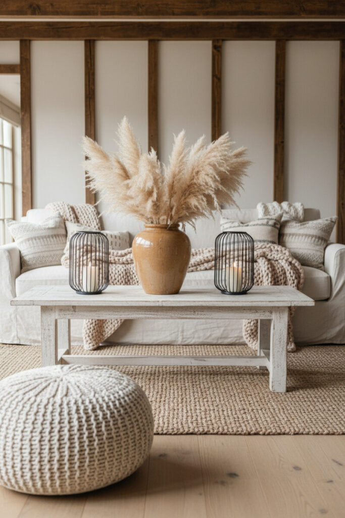 A whitewashed coffee table, pampas grass, and geometric lanterns sit on a dense jute rug, while chunky knit textiles pile onto a slipcovered sofa. Dark beams frame the scene. These layered neutrals are the DNA of rustic living room decor, and they photograph beautifully.