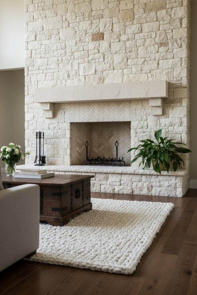 A floor-to-ceiling ledger stone fireplace, herringbone firebox, and chunky hand-knit rug are a texture trifecta. Pair with reclaimed-wood tables and deep greenery for striking contrast. If you’re compiling Farmhouse Living Room Ideas that revolve around a hearth, this one sets the standard.