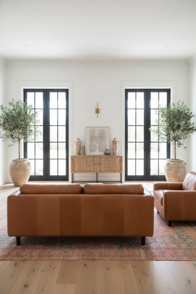Matte-black grid French doors create graphic contrast against crisp white walls. A tailored cognac leather sofa and cube chair introduce warmth and sophistication, while a distressed Persian rug layers in age and pattern. Add a rustic wood console and oversized earthenware urns with olive trees to soften the geometry. This is a masterclass in modern farmhouse living room drama—bright, sunlit, and intentionally edited.