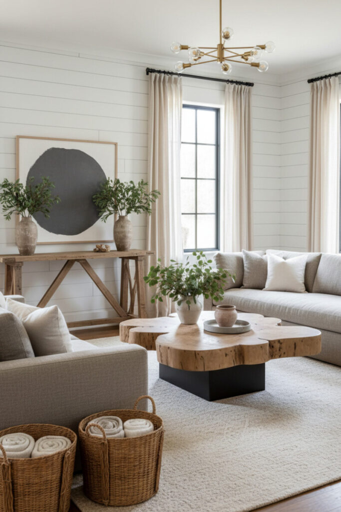 Shiplap walls, a warm-grey sectional, and a live-edge coffee table create natural flow. The table’s organic slab top pairs with a brass sputnik chandelier and woven baskets for an easy balance of shine and fiber. These choices deliver a cozy farmhouse living room with neutral palette without feeling flat.