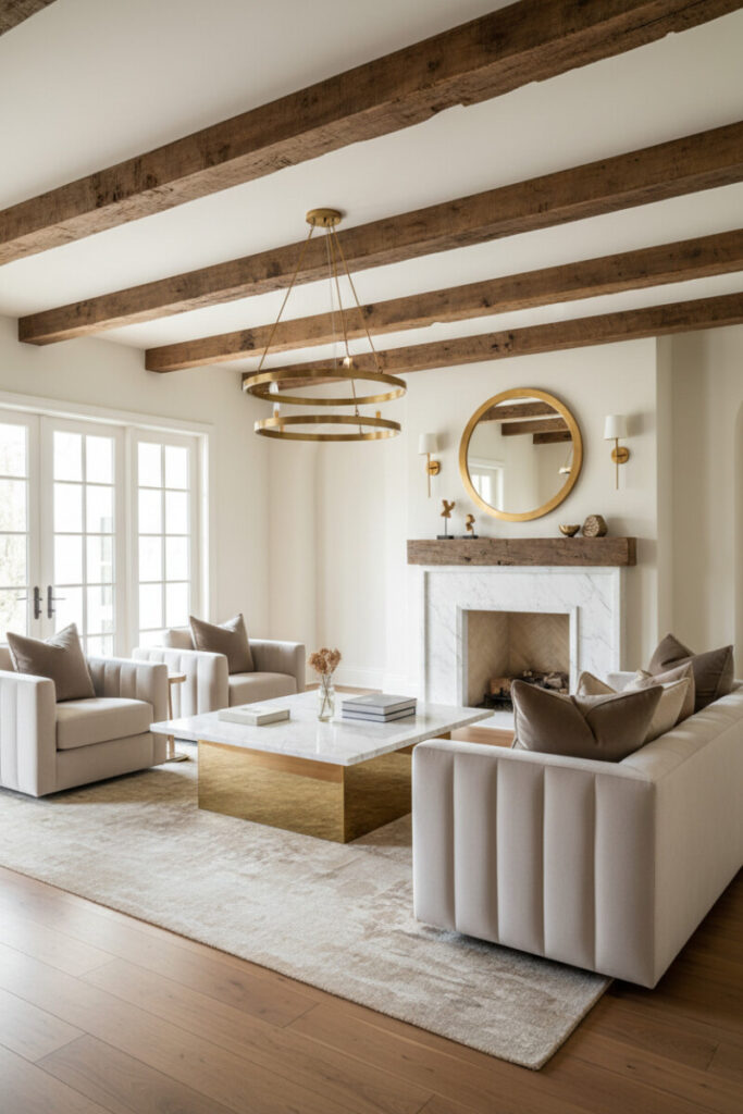 Rustic beams meet glam details: a white marble fireplace, brass ring chandelier, and marble-topped coffee table with a polished brass base. Channel-tufted armchairs bring plushness, while a muted rug grounds everything. This is a pinnacle of modern farmhouse living room elegance.