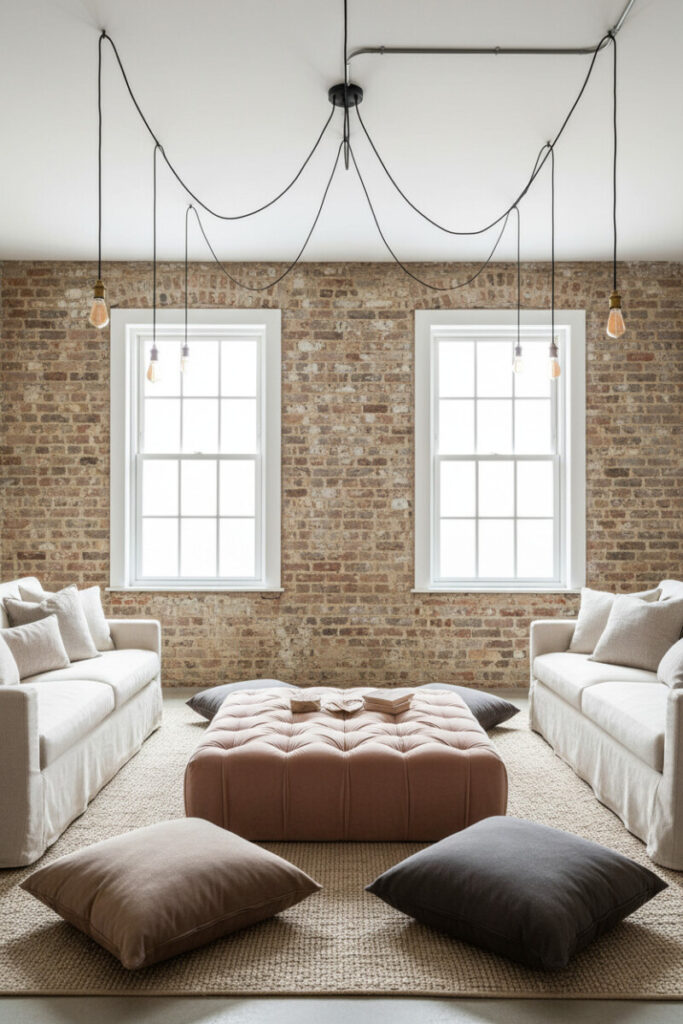 Weathered brick and dangling Edison bulbs skew loft-like, while creamy slipcovered sofas and a blush velvet ottoman soften the mood. Floor cushions add casual seating. It’s a versatile setup that merges rustic living room decor with airy urban charm.