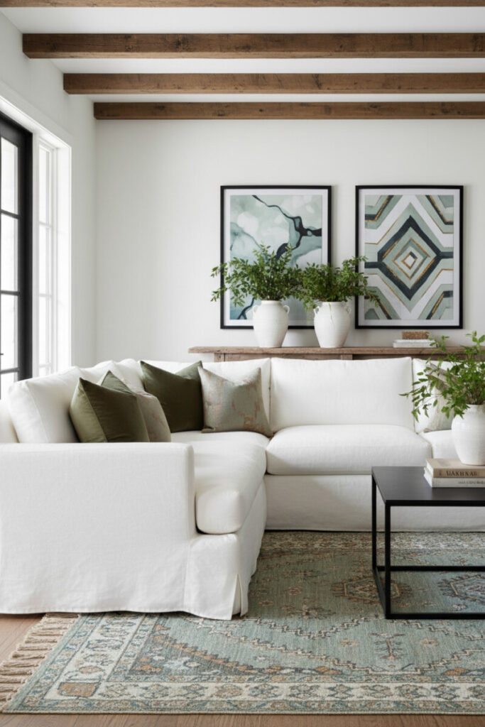 A cream sectional becomes the perfect backdrop for olive green pillows and a patterned rug in dusty sage and warm beige. Dark beams and black-framed art intensify the contrast. This is one of those Farmhouse Living Room Ideas where a single color family—greens—adds depth without busyness.