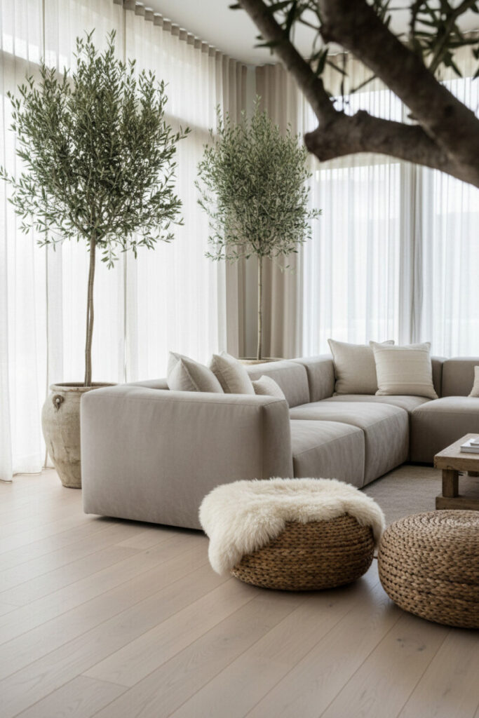 A low modular sectional in taupe pairs beautifully with two mature indoor olive trees in rustic planters. Seagrass poufs and a sheepskin throw lend tactile delight. Bathed in bright natural light, the arrangement epitomizes a cozy farmhouse living room with neutral palette enlivened by botanicals.