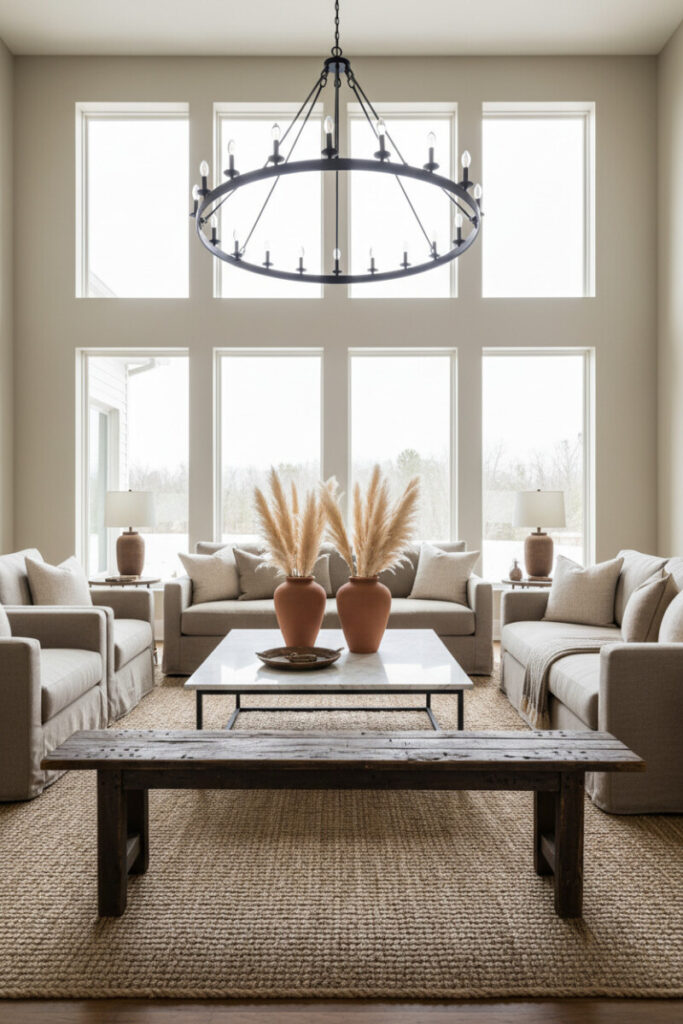 An oversized wagon-wheel chandelier presides over slipcovered seating and a thick jute rug. On the polished marble table, matte terracotta vases filled with pampas grass bring sculptural height. If you want Farmhouse Living Room Ideas that feel grand yet approachable, this is your blueprint.