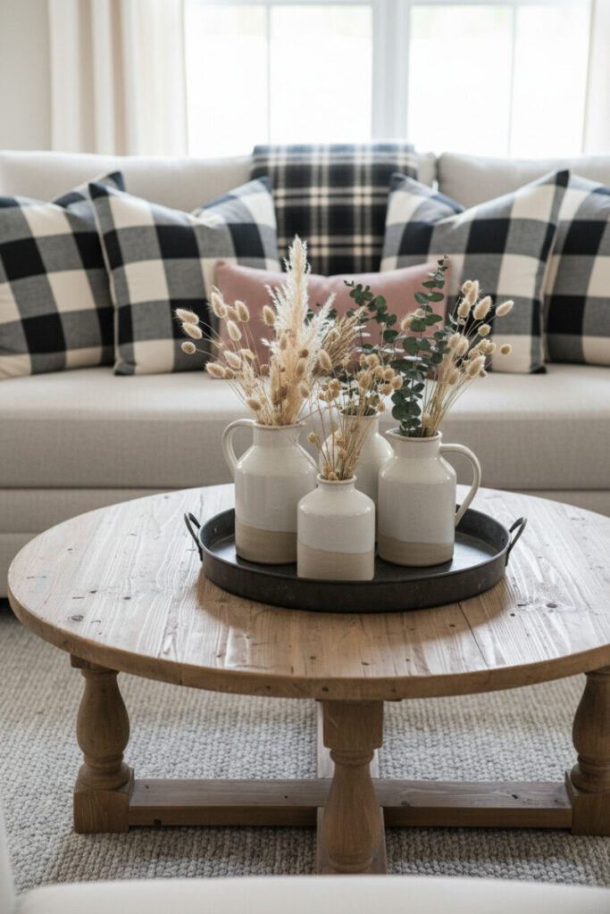 A weathered, round wood coffee table hosts creamy stoneware vases, while a sofa in tartan pillows and fringed throws nods to vintage style. The soft background keeps the vignette feeling fresh. This is an easy weekend refresh—swap in plaid textiles to channel rustic living room decor with personality.