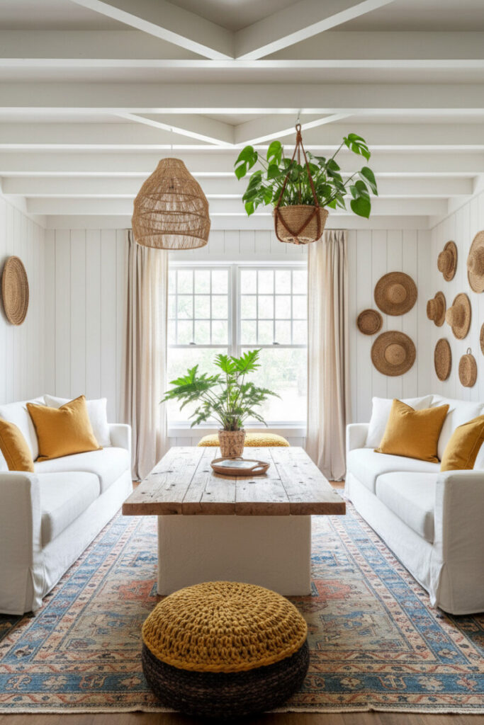 Two loose white slipcovered sofas flank a raw wood coffee table on an indigo-and-rust rug. Mustard ochre pillows and a macramé pendant inject boho joy, while a leather-strapped planter drips with greenery. It’s a content-rich composition that still reads calm—excellent for modern farmhouse living room spaces craving color.