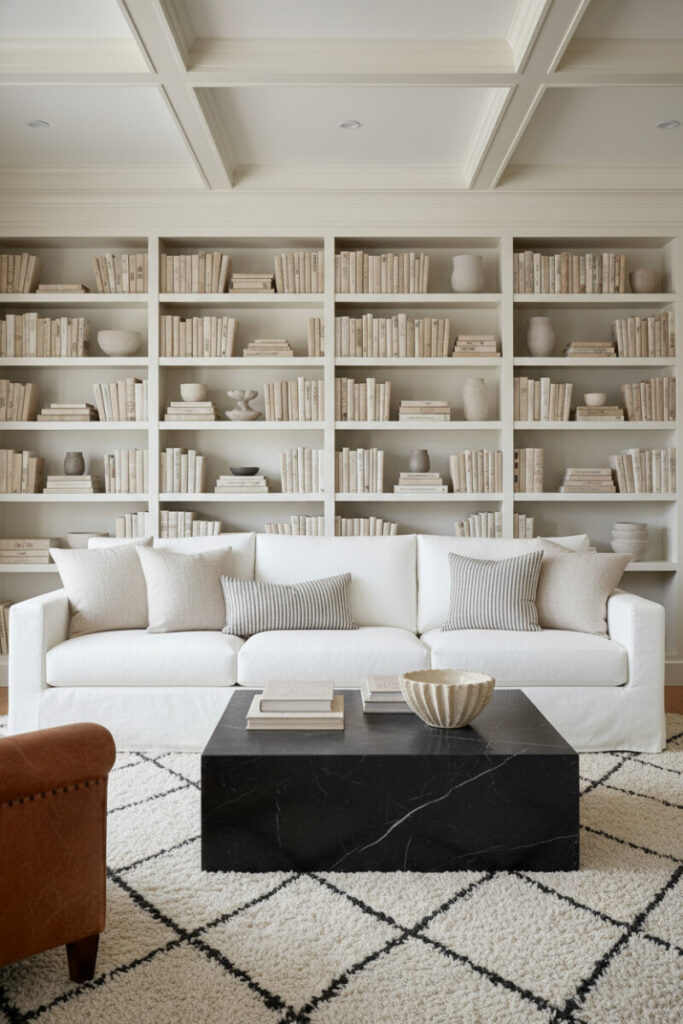 A chalk-white built-in wall packed with cream-bound books feels curated and calm. Center the room with a square Nero Marquina marble coffee table; its sleek form anchors a deep white slipcovered sofa and shaggy Berber rug. The limited palette—whites, creams, and black—gives editorial polish. For Farmhouse Living Room Ideas that feel high-end yet cozy, contrast plush textiles with one bold, stone statement.