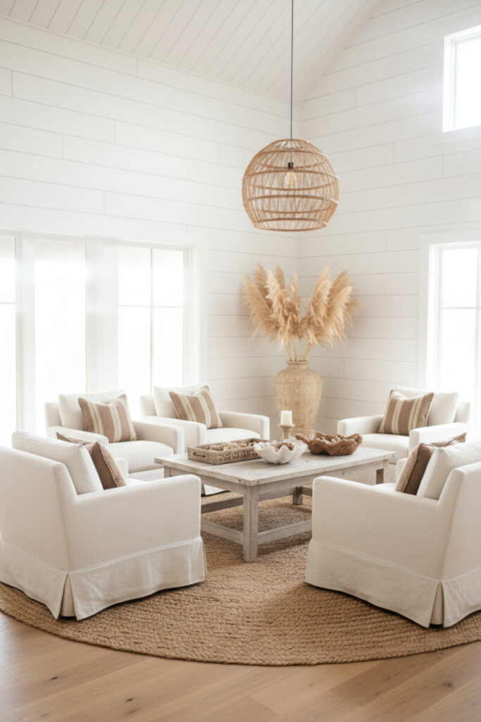 Cream linen armchairs circle a distressed whitewashed table, all set against floor-to-ceiling white shiplap. A woven pendant and pampas arrangement add height. The strictly neutral palette is a textbook example of farmhouse living room ideas with shiplap that feel airy and timeless.