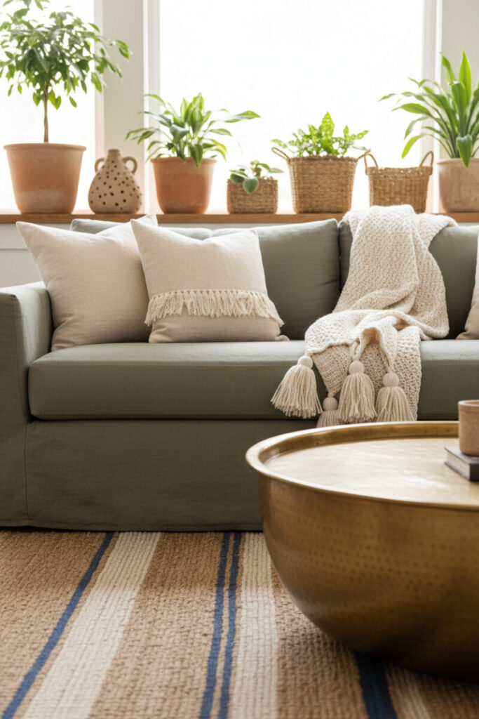 A muted sage linen sofa pairs with a hammered brass coffee table for a subtle metallic counterpoint. Behind it, unglazed terracotta planters and rattan baskets hold lush plantings. The rug’s jute stripes (with hints of blue) add rhythm. For Farmhouse Living Room Ideas that honor nature, this palette is pitch-perfect.