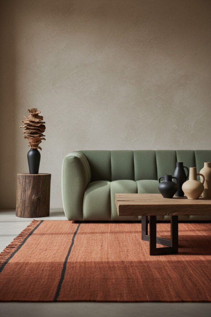Channel tufting in matte sage green gets bolder when set on a terracotta rug under a limewashed wall. A thick slab table and stacked ceramics tie earth tones together. Soft daylight and elongated shadows make this a dreamy cozy farmhouse living room with neutral palette—with a warm, earthen twist.