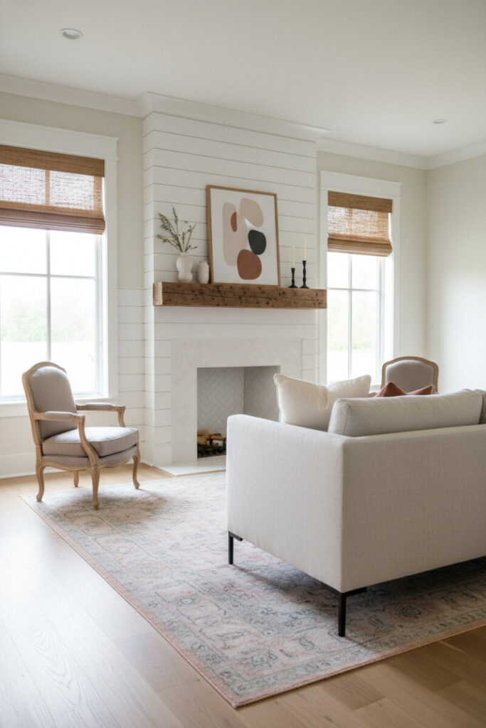 A shiplap-clad fireplace and reclaimed mantel balance a tailored cream sofa and French-style armchairs. Light-filtering woven shades and a faded blush-and-grey rug introduce heritage charm. Minimal art in terracotta and black grounds the scene, extending your list of Farmhouse Living Room Ideas rooted in tradition.