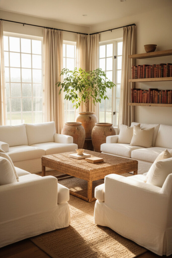 Golden-hour sunlight streams across white slipcovers and a rattan coffee table. Massive terracotta jars in the corner and floating wood shelves of weathered books add charm. This luminous setup expands the possibilities for Farmhouse Living Room Ideas, reminding us how transformative window light can be.