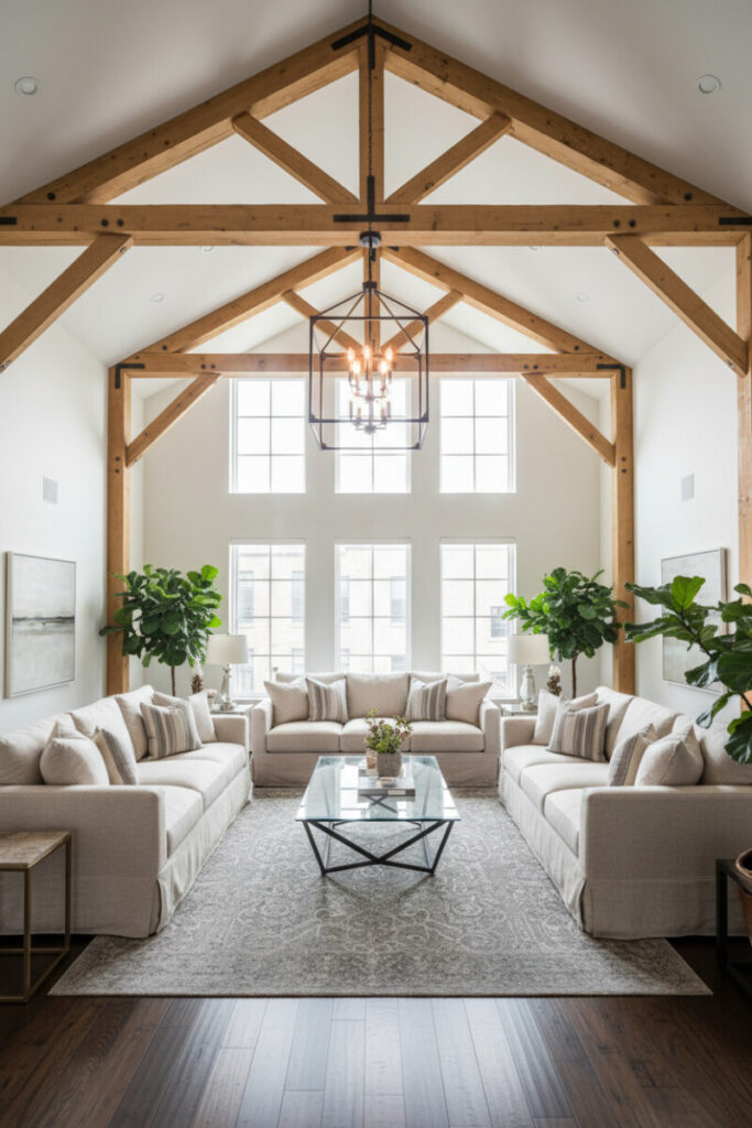 Vaulted ceilings with honey-toned truss beams and a bronze chandelier create quiet drama. Oatmeal linen sectionals, a geometric steel-base coffee table, and espresso floors deliver a balanced loft aesthetic. Plants and modern art punctuate the white walls, making it a standout modern farmhouse living room for expansive spaces.