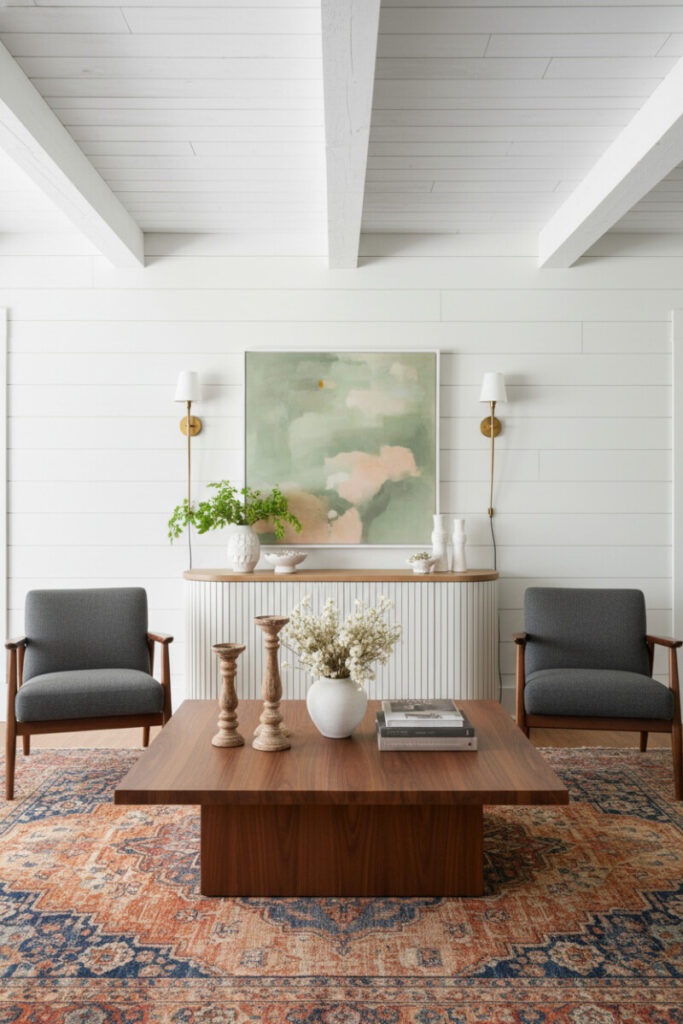An eclectic mix: whitewashed shiplap, exposed beams, and a dark walnut coffee table styled with candlesticks and pottery. Charcoal Mid-Century chairs sharpen the rustic shell, while a distressed rug in terracotta and indigo warms the palette. This hybrid approach is a goldmine of Farmhouse Living Room Ideas for collectors.