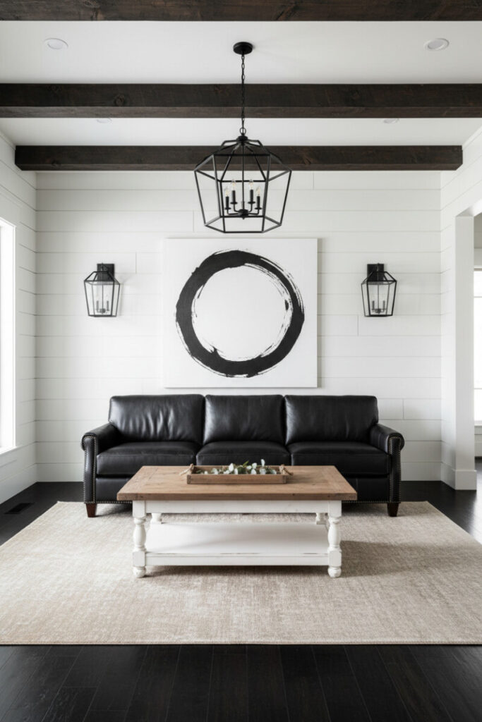 Here, white shiplap sets a bright stage for black leather seating, a bold brushstroke artwork, and iron lantern sconces. A distressed two-tone coffee table bridges rustic and refined. The interplay of matte black and natural wood highlights the beauty of shiplap—great proof that farmhouse living room ideas with shiplap can read dramatic, not just sweet.