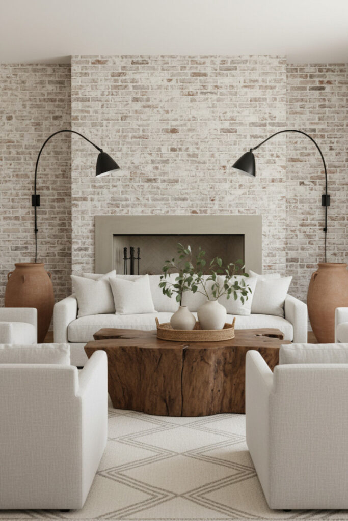 A whitewashed brick wall with fireplace cutout is flanked by black gooseneck sconces and layered with off-white seating. A chunky live-edge table showcases heavy grain, while rattan trays and terracotta vases layer in natural texture. The look is crisp yet grounded—prime rustic living room decor for bright homes.