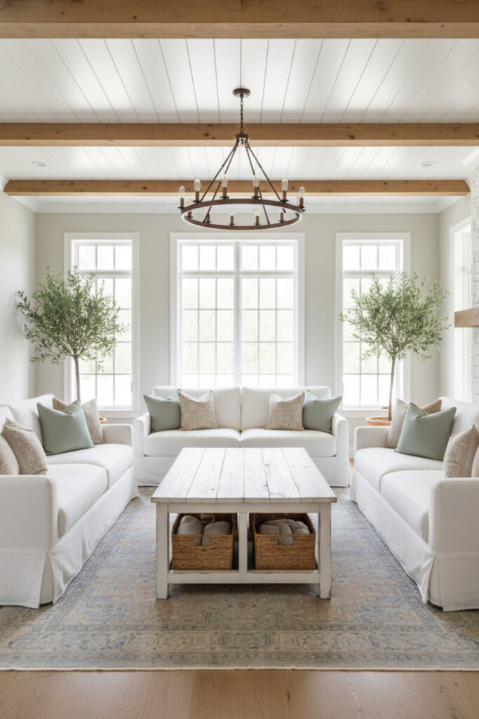 Twin white slipcovered sofas, a chunky distressed coffee table, and a faded rug in dusty blue and taupe create inviting balance. A bronze chandelier and shiplap ceiling contribute classic farmhouse notes. This composition epitomizes a cozy farmhouse living room with neutral palette that still feels layered and lived-in.