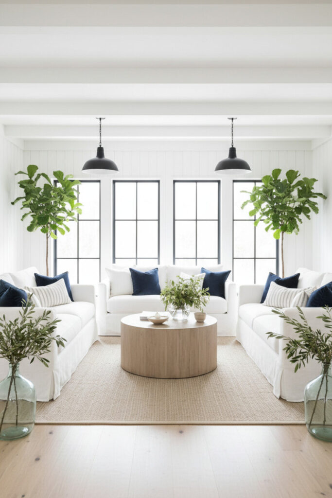 Three oversized white sofas arranged around a bleached-oak round table make a statement in symmetry. Navy pillows add crisp contrast, while black barn pendants echo black window frames. The greenery-filled demijohns amplify freshness—an easy upgrade among Farmhouse Living Room Ideas for all-white rooms.
