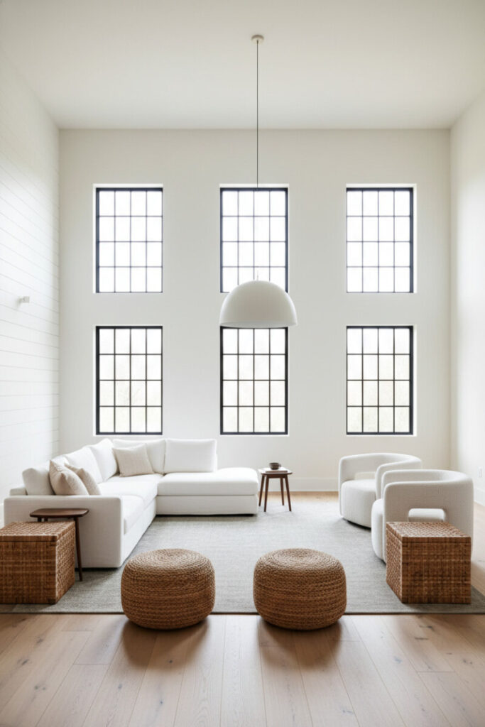 A modular white sectional meets rounded bouclé chairs on a pale natural-fiber rug, beneath towering black-framed windows. Jute poufs and rattan cubes add casual seating; a single dome pendant keeps things clean. This design shows how farmhouse living room ideas with shiplap (on one wall) can slide into Scandi minimalism.