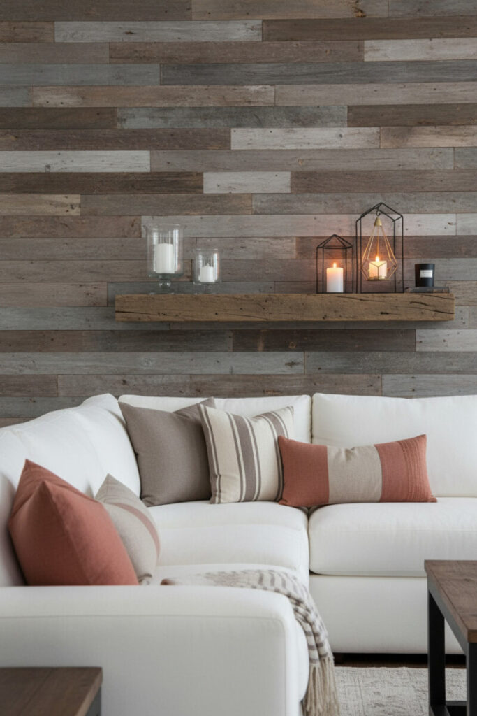 A reclaimed wood floating shelf mounted on vertical shiplap in variegated greys displays glass hurricanes and geometric black lanterns. Below, a plush white sectional with striped and rosy pillows completes the scene. The glow of candlelight softens the textures, offering one of the simplest Farmhouse Living Room Ideas to try tonight.