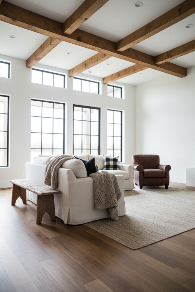 Crittall-style windows and rough-hewn beams balance crisp architecture with organic grain. A cream slipcovered sofa, plaid pillows, and a dark leather chair establish cozy contrast. This space celebrates materials—sleek metal, rustic wood, woven rug—showing how rustic living room decor can coexist with modern lines.