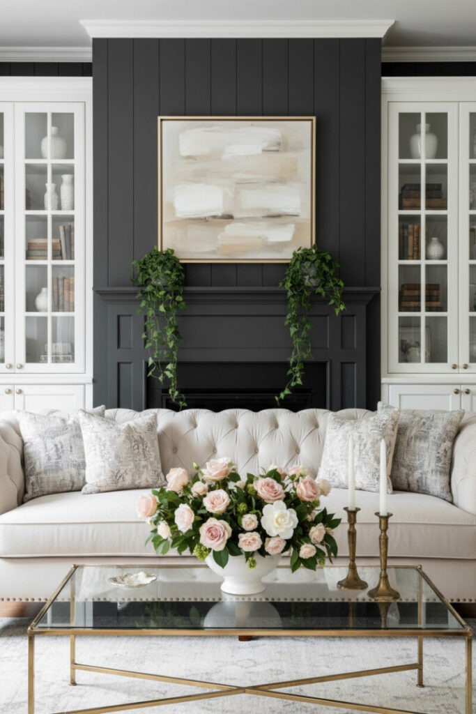 A matte charcoal paneled wall behind a creamy tufted Chesterfield is moody perfection. Brass and glass accents, floral arrangements, and candles soften the darkness. The palette—charcoal, ivory, and whispering pinks—feels sophisticated without being formal, expanding your toolbox of Farmhouse Living Room Ideas for evening ambiance.