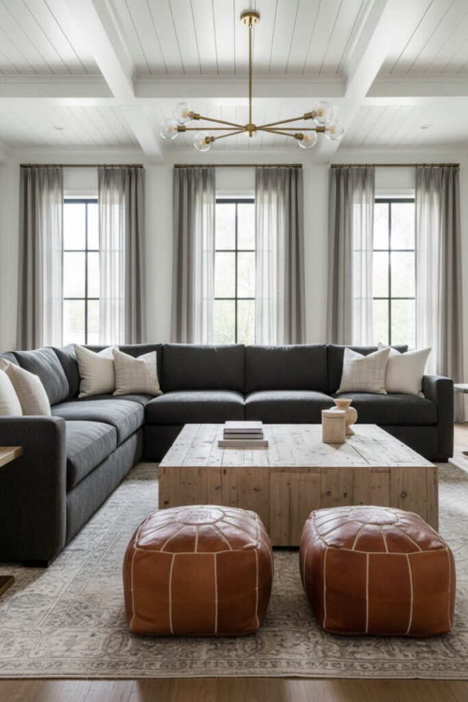 A deep charcoal modular sofa sets the tone for a space rich in texture—reclaimed wood coffee table, cognac Moroccan poufs, sheer greige curtains, and a brass linear chandelier. It’s grounded yet luxe. When you’re exploring rustic living room decor, let leather and distressed wood lead while fabrics soften the effect.