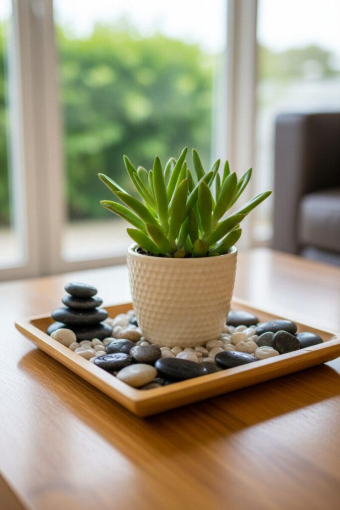 Zen is a mood, and this scene shows how to achieve it with almost nothing. A creamy, dimpled pot holding a glossy succulent sits inside a square bamboo tray. Scatter pearlized white pebbles as the base layer, then add a small stack of charcoal stones as a counterpoint. The contrast in tone and texture keeps the arrangement from looking flat. This is one of those Tray Decorating Ideas that thrives on restraint—three elements, three textures, one calm moment. For coffee table tray decor, limit the height so conversation flows over it, not around it.