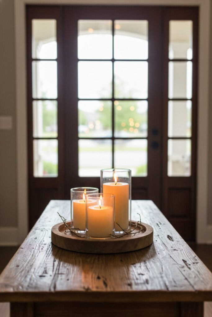 On a rustic console, place four cream pillar candles in glass cylinders on a small round tray. The entryway door’s daylight becomes a natural backlight, so flames look jewel-bright even during the day. Add a sprig of twigs or dried botanicals at the base for texture. These Tray Decorating Ideas set the tone the moment you walk in—warm, calm, and welcoming.