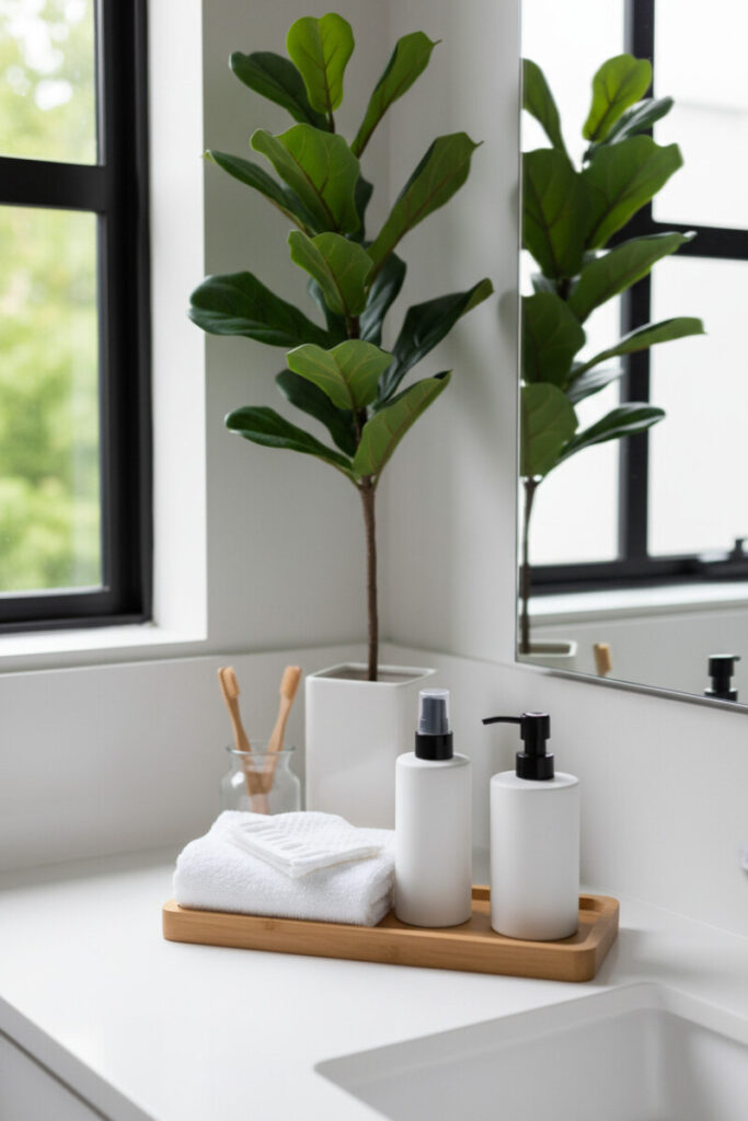 A compact bamboo tray can transform a cluttered sink into a serene still life. Fold a hand towel, line up a soap dispenser and two spray bottles, and park a jar with wooden toothbrushes behind. The showstopper is a tall fiddle-leaf fig branch—faux or real—bringing sculptural green to all the crisp whites. This is one of those bathroom tray ideas for guests that also works for daily life: the essentials are visible, sanitized by light, and easy to restock.