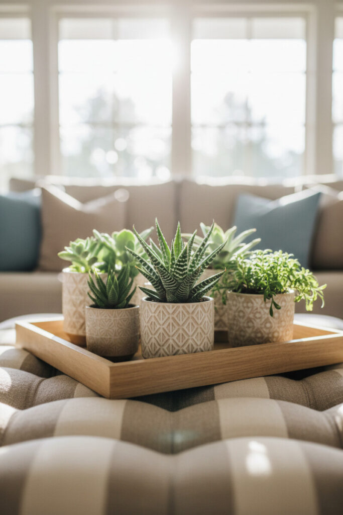 On a striped ottoman, a square light-wood tray holds a flotilla of succulents in neutral pots. The trick is variety: mix rosettes (Echeveria) with spiky friends (Haworthia) and one trailing element for movement. Strong daylight from the window creates a rim-lit halo around leaves—perfect for photographs. When thinking about how to style a tray on a coffee table, remember the trio rule: one tall, one medium, one low element to keep the eye moving.