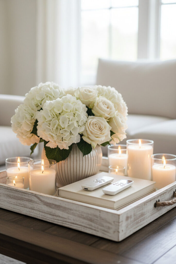 A distressed whitewashed tray carries a ribbed vase of white blooms, flickering glass-clad candles, and—keeping it real—two remotes stacked on cream books. The beauty of this coffee table tray decor is balance: romance from the flowers, function from the remotes, glow from candlelight. Swap blooms with seasonal branches to make the scene feel fresh all year.