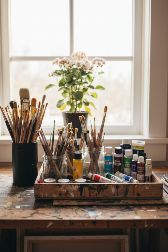 Creativity loves order. On a paint-splattered workbench, a rectangle wood tray organizes jars of brushes, pencils, and paint tubes, with a taller black cylinder of brushes acting as an anchor. A small plant on the windowsill adds life without stealing focus. These Tray Decorating Ideas prove even messy spaces can have style: by giving every tool a “home,” you save time and showcase your materials like the pros do.