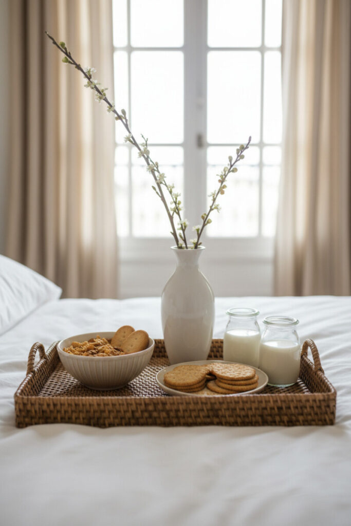 Breakfast-in-bed energy without the mess: a woven rattan tray on crisp white linens offers a ribbed bowl of cereal, a plate of crackers, and two small jars of milk. A tall white vase with delicate sprays punctuates the center. For hospitality, leave a little note about breakfast hours or Wi-Fi inside the tray. These Tray Decorating Ideas make guests feel cared for and keep crumbs contained.